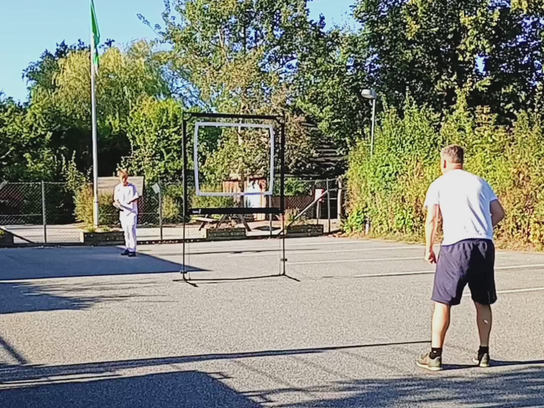 Sæt spillenettet op på vejen, basketbanen, hallen, terrassen, parkeringspladsen eller måske padelbanen, hvor du har lyst. Når du har lyst! 1 spiller på hver side af nettet, spil en bold gennem nettet og spil med dit eget padel bat - det er simpelt. Sæt banemarkør på banen og spil evt. med stage 2 tennisbolde for nemmere spil.